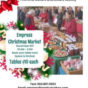 Empress Christmas Market Empress Christmas MarketDecember 6th : 10 AM - 3 PMBook ... 06 Dec 10:00 am - 3:00 pm Empress Community Hall314 Center Street, Empress, AB