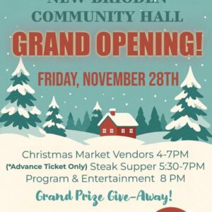 Grand Opening – New Brigden Community Hall Winter Wonderland NEW BRIGDEN COMMUNITY HALL GRAND OPENING! FRIDAY, NOVEMBER 28TH, Christmas Market ... 28 Nov 4:00 pm - 9:00 pm New Brigden Community HallNew Brigden, AB